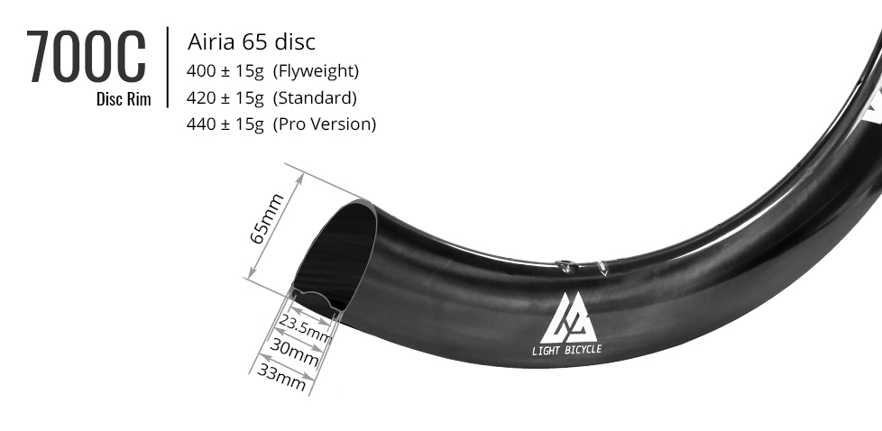 The Airia 65 disc is a high-performance road racing and aero rim with superb lightweight and its 65mm deep profile. The rim's inner width (23.5mm) suits the current mainstream 28C and 30C road tires, which basically complies with the 105% rule of thumb and reduces the aero drag.Its symmetric profile provides balanced spoke tension and predictable handling at race pace.