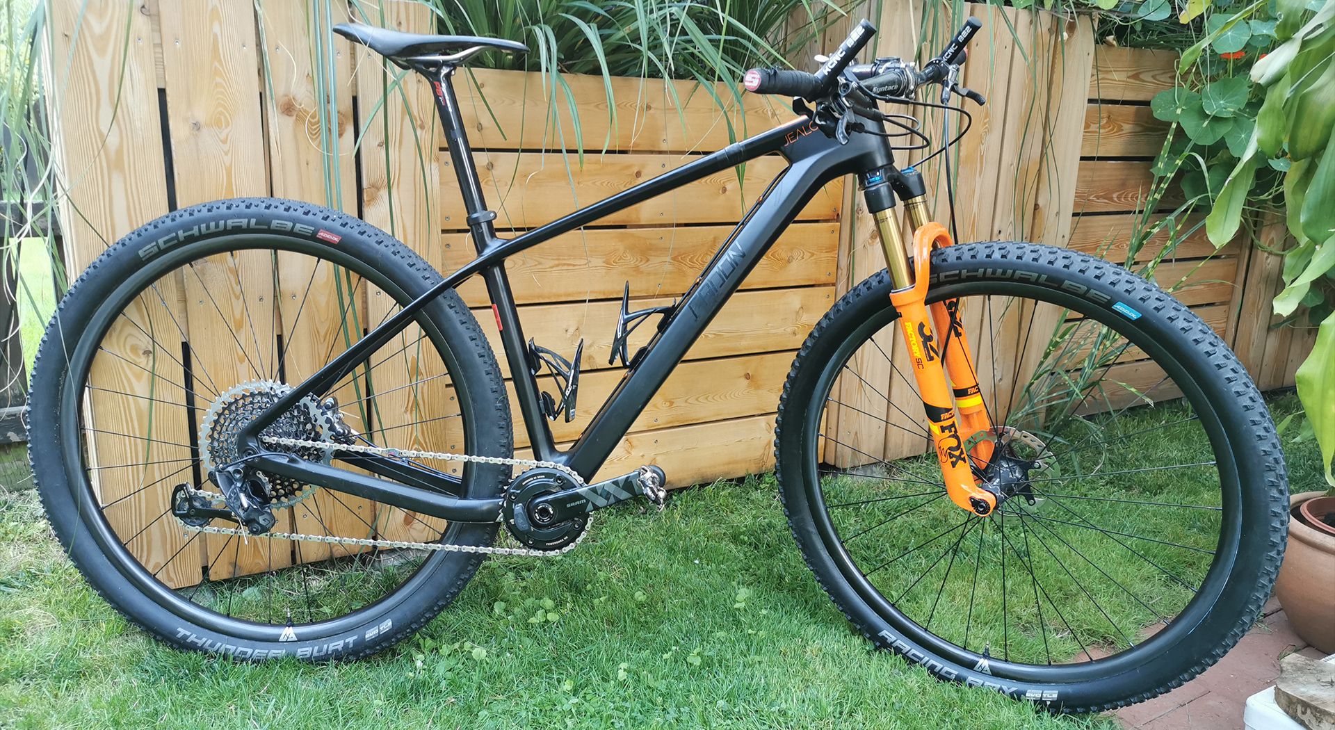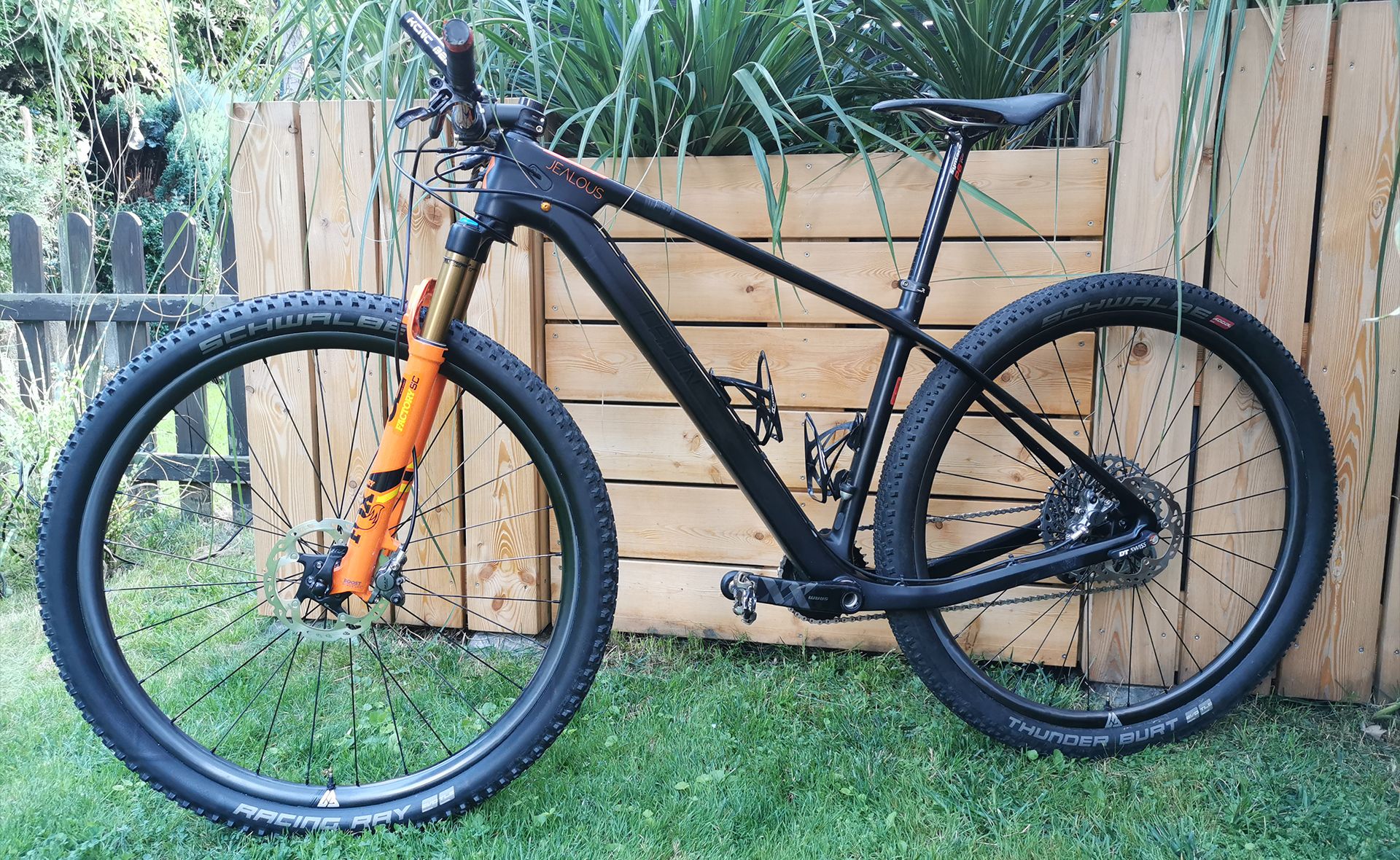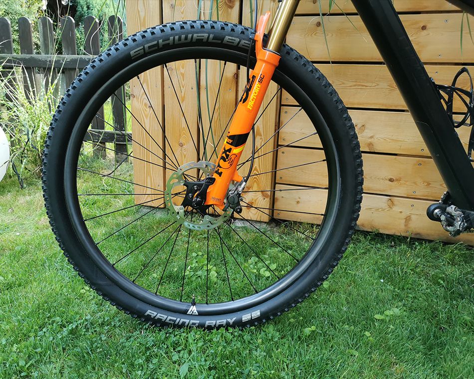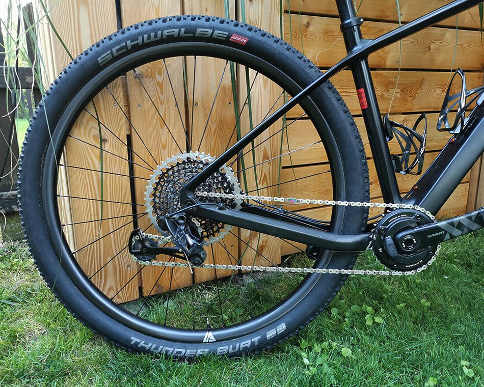 Tires : Schwalbe Racing Ray 29x 2.25” tubeless front; Schwalbe Thunder Burt 29x2.25” tubeless rear